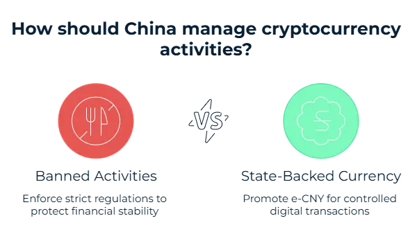 The Chinese government strictly opposes private crypto use but supports blockchain and its own digital yuan (e-CNY).