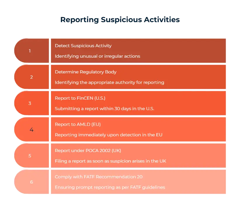 There are several regulatory bodies that deal with these kinds of suspicious activity. We’ve compiled the data you need for knowing when to report these suspicious activities or transactions. For those who are residing in the U.S., FinCEN is your way to go when reporting. FinCEN demands that when you’re against odd activities, you should report within 30 days of detecting the said activity. This ensures safety and compliance.