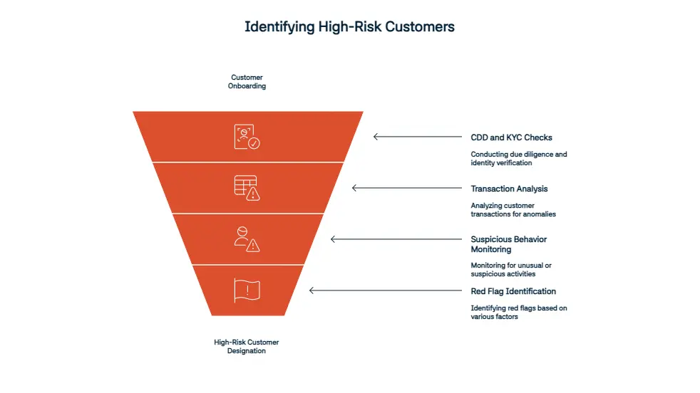 Banks use risk-based approaches, including KYC checks, transaction monitoring, and enhanced due diligence (EDD) to assess customer profiles, detect red flags, and determine if an account should be classified as high risk.