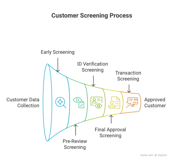 Timing of screening depends on multiple factors such as regulatory expectations, operational design, and risk appetite. For example, it may take place after collecting sufficient data but before granting account access or processing the first transaction. However, a simple initial screening can detect obvious matches before investing time and resources in full KYC (Know Your Customer) as well.