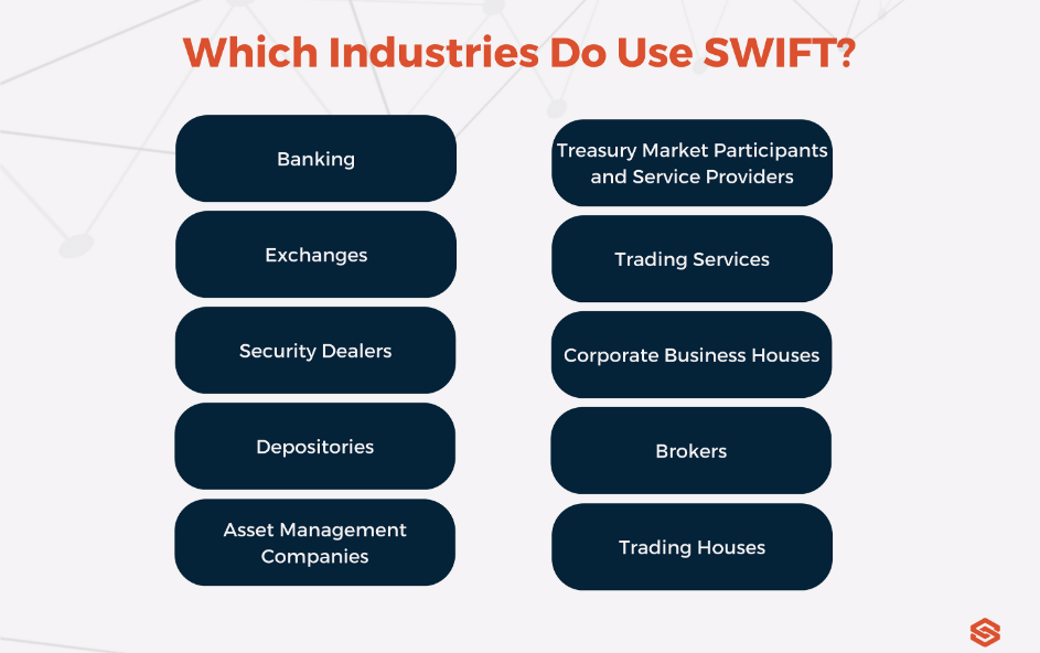Although SWIFT was only used for treasury transactions when it was first established, it has gradually developed and serves many sectors today. These sectors include treasury market participants and service providers, banks, exchanges, trading services, securities dealers, corporate business houses, asset management companies, depositories, brokerage institutes and trading houses, foreign exchange, and money brokers.