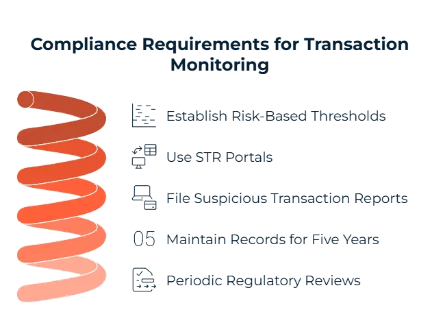 There are some requirements your company should follow when transaction monitoring. Risk based monitoring thresholds being established is recommended by our team at Sanction Scanner since it helps with choosing which type or what amount of transaction is alert worthy. Suspicious Transaction Reports (STR) portals like goAML, FinCEN and AUSTRAC must be used and the STR must be filed after noticing suspicious activity. You should also maintain records for at least five years to ensure an audit trail. Our final requirement is that these systems and records that are about transaction monitoring should be periodically reviewed by regulators to make sure nothing is wrong.