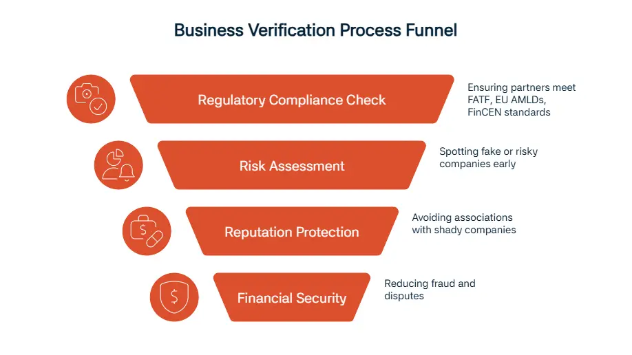 Business verification reduces risks of fraud, money laundering, shell companies, and sanctioned entities.